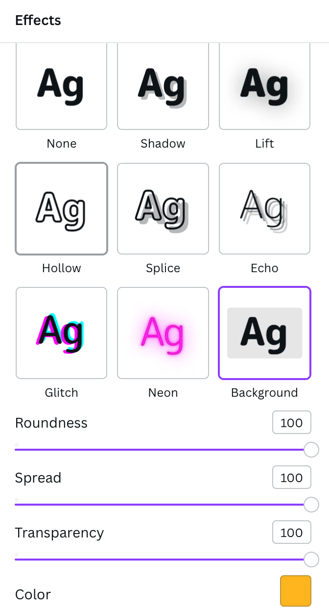 Now that there is text, let’s can create the pill shape button behind the text. Canva makes it so incredibly easy! You’re going to select the text you’re working on and go to the top toolbar to Effects > Background. Here you can change the roundness, spread, transparency, and color to create the button. Now we have text that looks like a button!