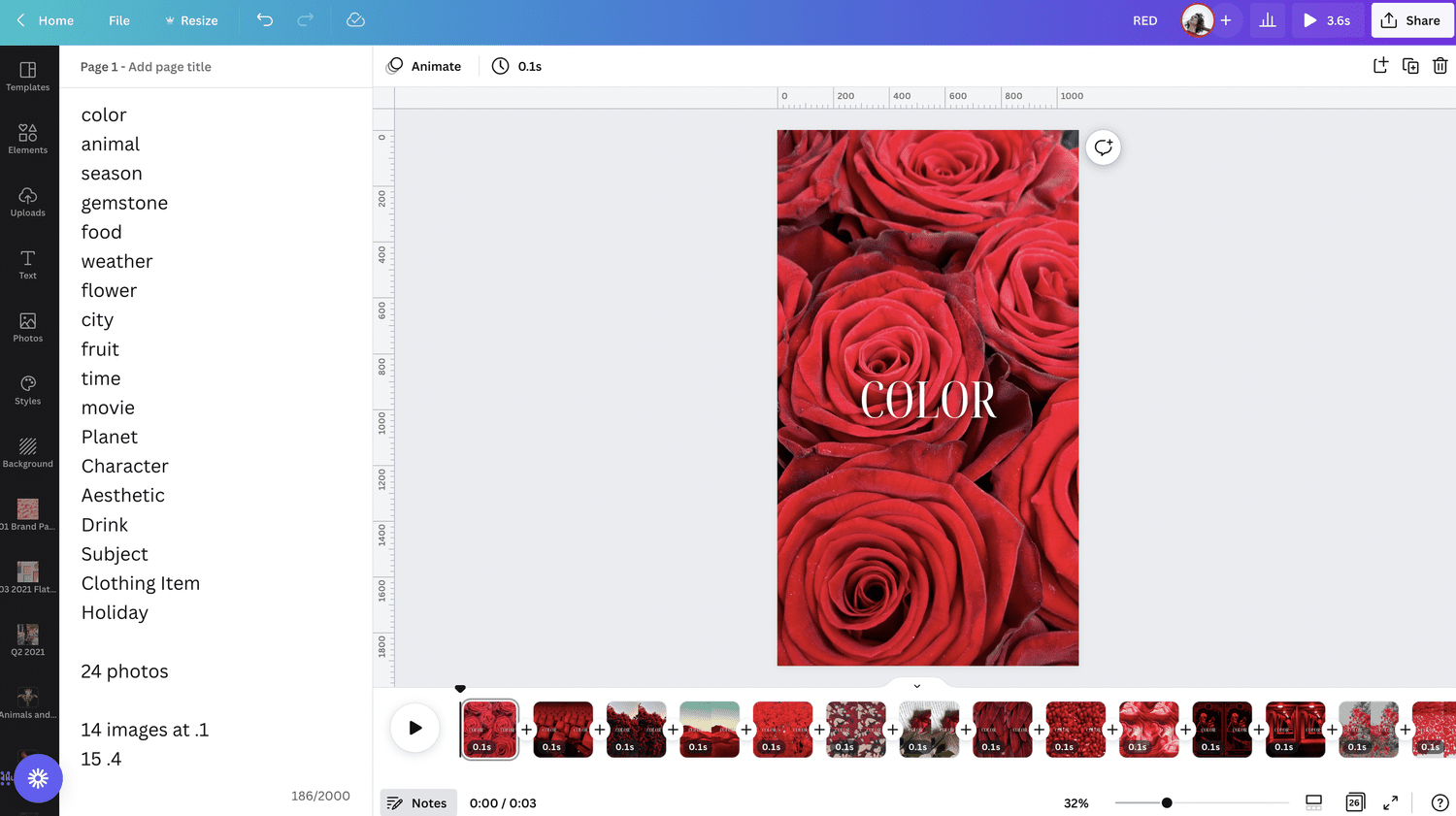 Notice how the first 13 photos are .1 second, then the 14th photo is .4, and then 8 are .1 photos. Then, you’ll take two slides at the end at .5 and .4 seconds to do a word split in half or two words.