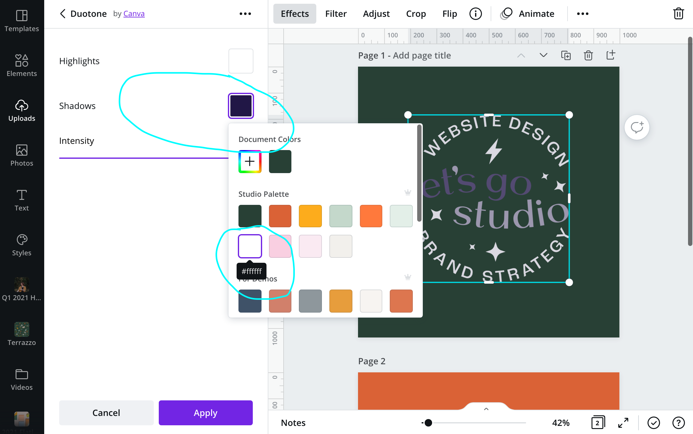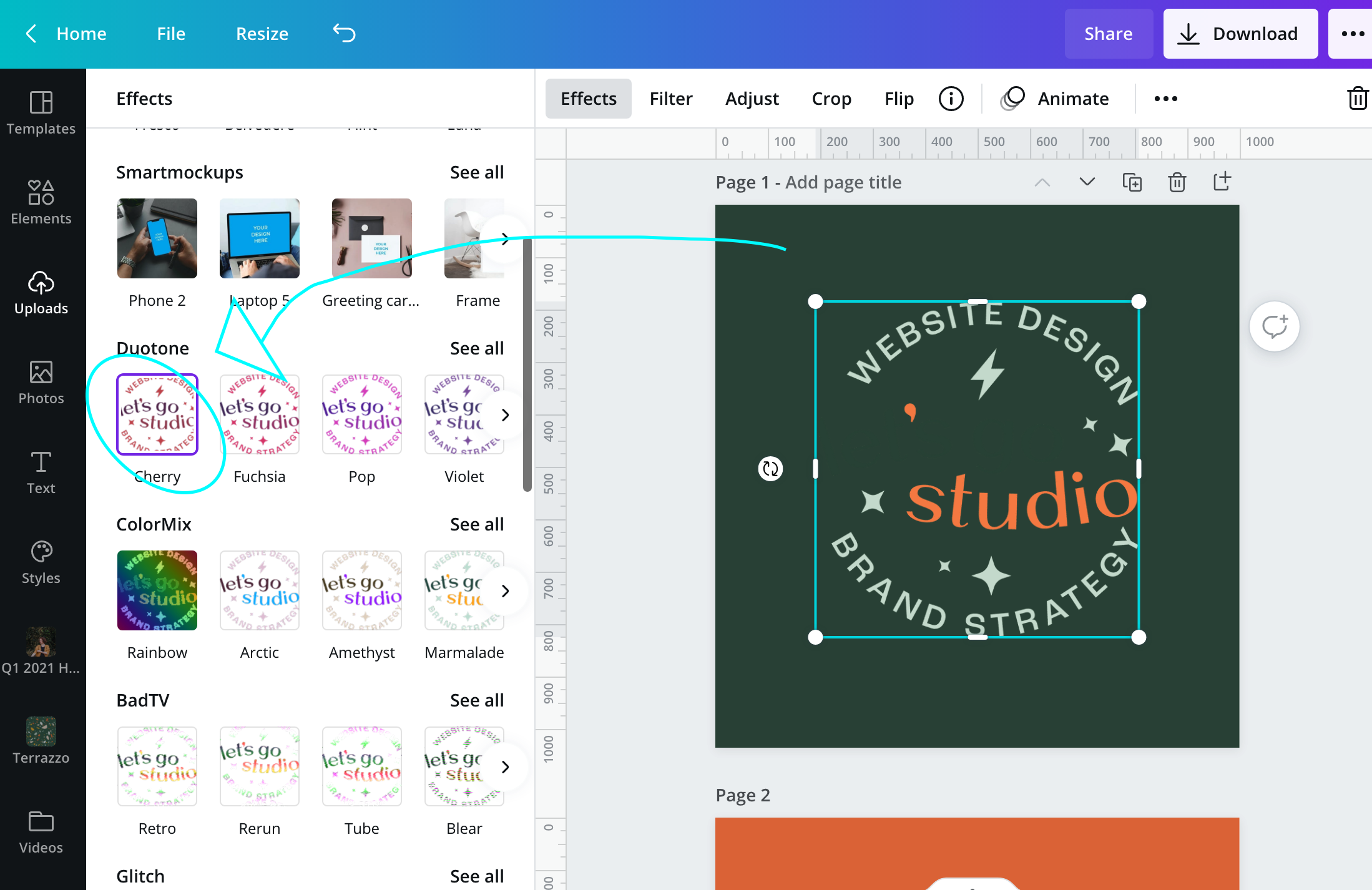 Click “DuoTone.” This is a fancy effect that applies two colors to Canva. Pick any effect, they will end up the same.