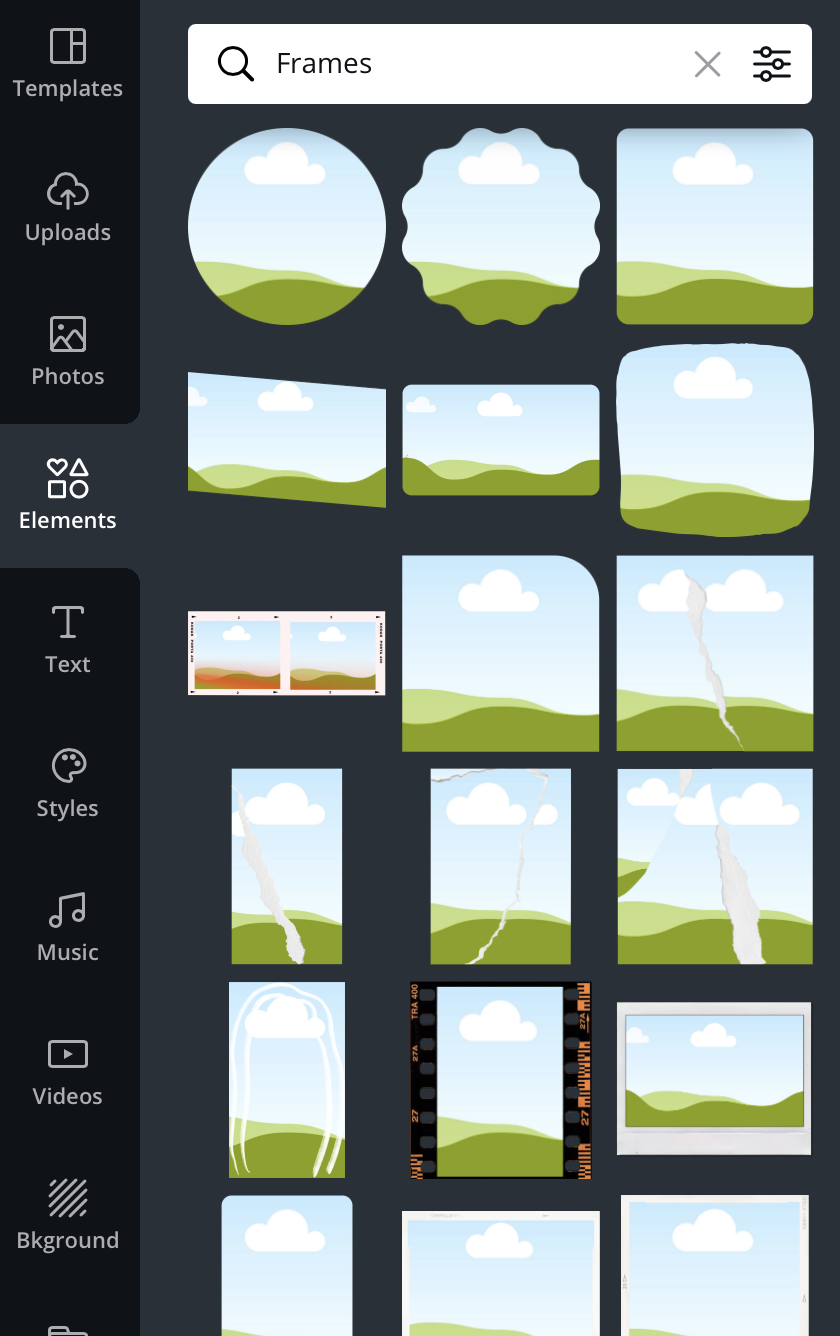 I took to my computer and looked under “Elements” and then “Frames.” This is where Canva has all of its frames, which is how you put your photos into cropped shapes. (In Photoshop or Illustrator, you would use a clipping mask, but in Canva you are at the mercy of their frames.)