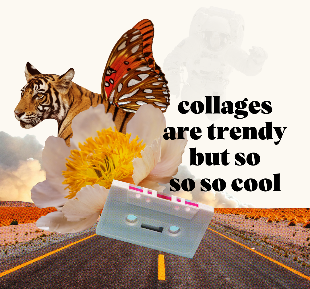 This design trend is near and dear to me, for its roots in physical book-print design but also for the space for creativity and randomness that collage invites. You can let your creativity run wild, while staying within your brand’s character, using Canva elements, Creative Market assets, and your own brand features. How many of the trends on this list can you find in this collage?